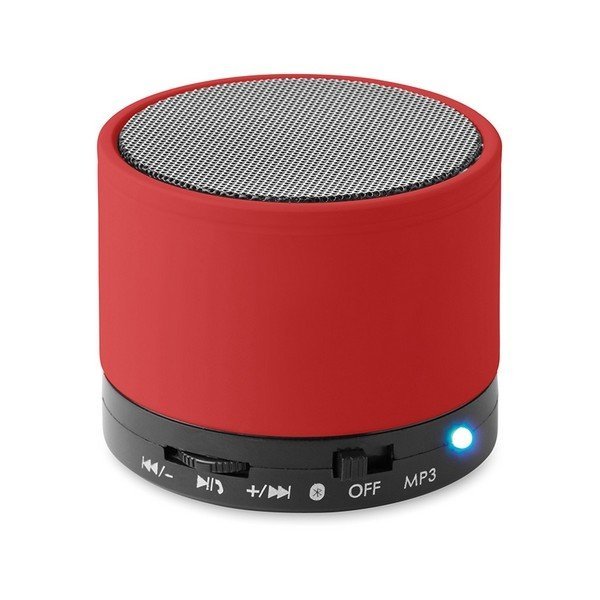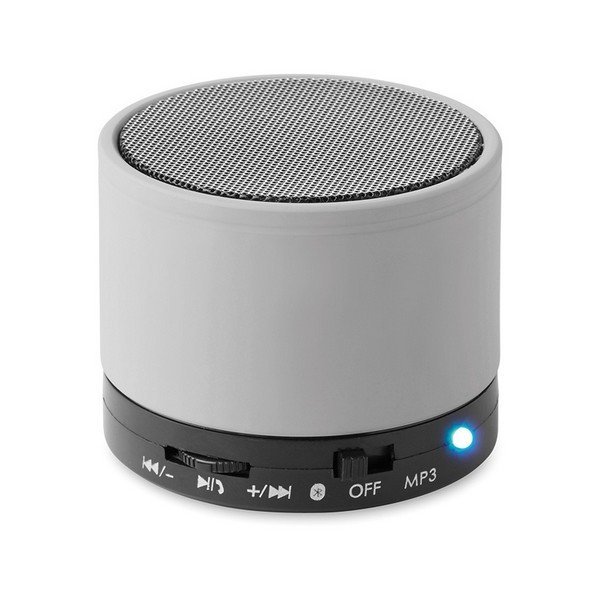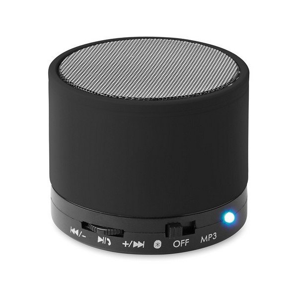 Altavoz Bluetooth 2.1 en ABS acabado de caucho. Incluye puerto para tarjeta SD y un cable AUX/USB. Incluye microfono para manos libres. Batería recargable de litio 300 mAh. Medidas: 5,9Øx4,9 cm. Peso: 250 gr.