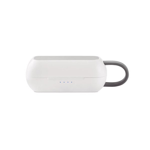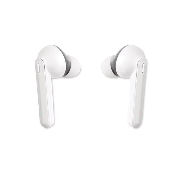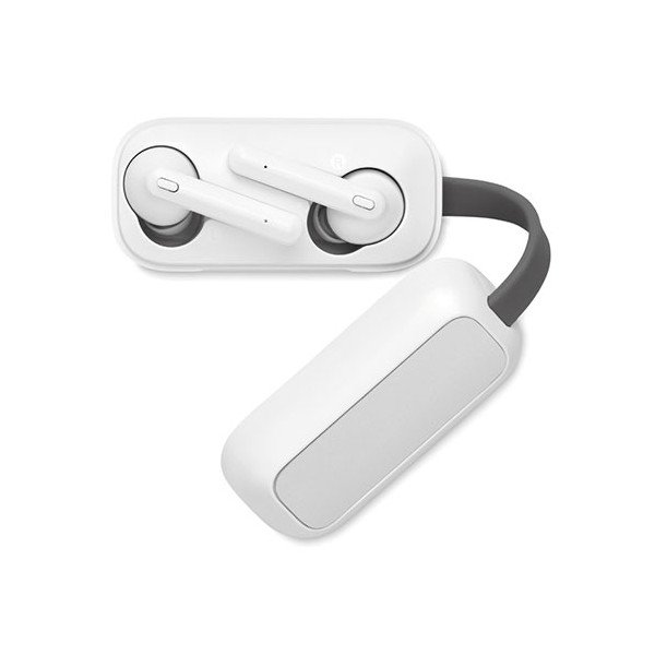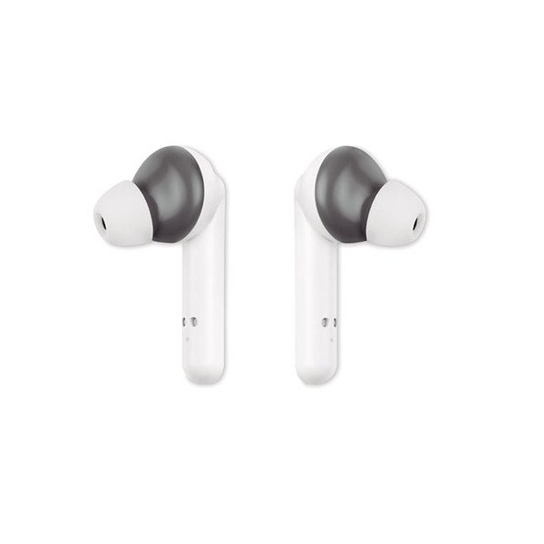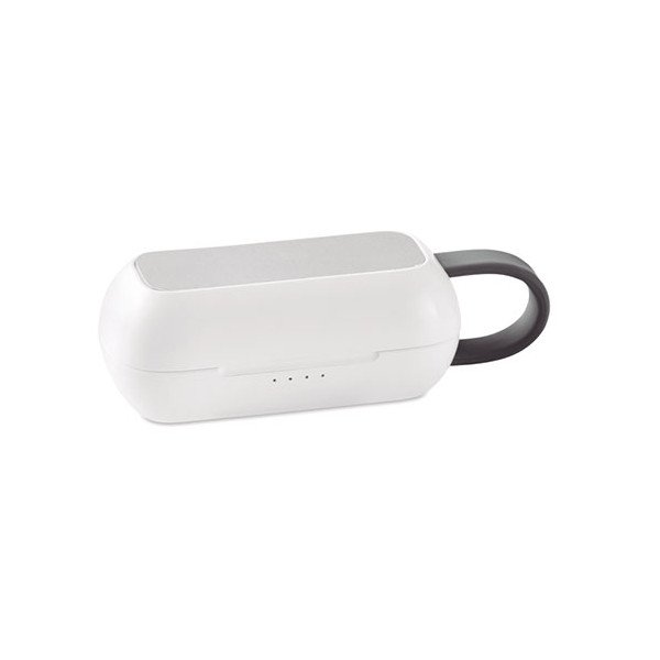 Set auriculares (TWS) con base de carga. Medidas: 7,7x7,6x3 cms. Peso: 55 grs. Composición: Mezcla.