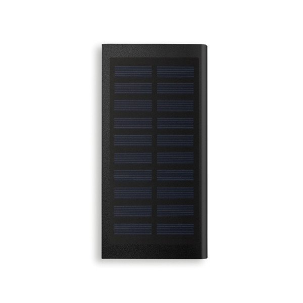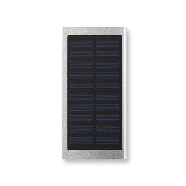 Powerbank solar de aluminio de 8000 mAh. Compatible con smartphone. Output DC5V/1A y DC5V/2A. Incluye indicador de luz y cable micro USB. La carga por luz solar está orientada para uso en caso de emergencia. La carga solar es menos eficiente que la carga por cable USB. Medidas: 7,5x15x1 cms. Peso: 210 gr. Composición: Aluminio.