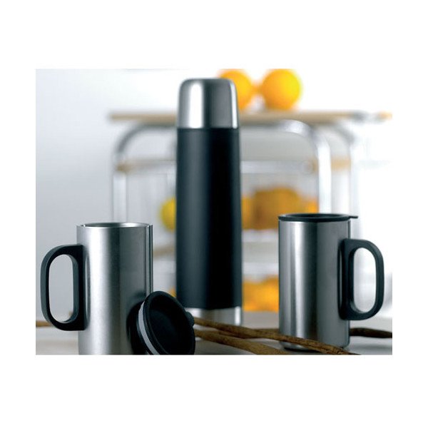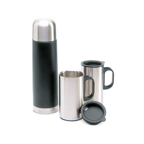 Botella en acero inoxidable (500 ml) con 2 tazas (220 ml) en caja de regalo de cartón. Medidas: Ø6,5x24,5cm.