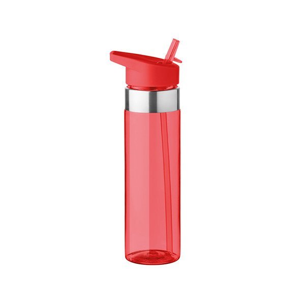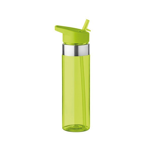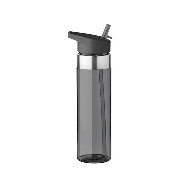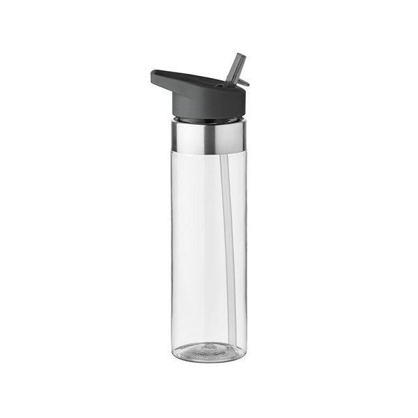 Botella en tritán de 650 ml con detalle de acero inoxidable y boquilla plegable. Medidas: 8x24.3cms. Peso: 100 gr. Composición: Plástico.