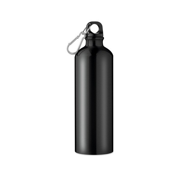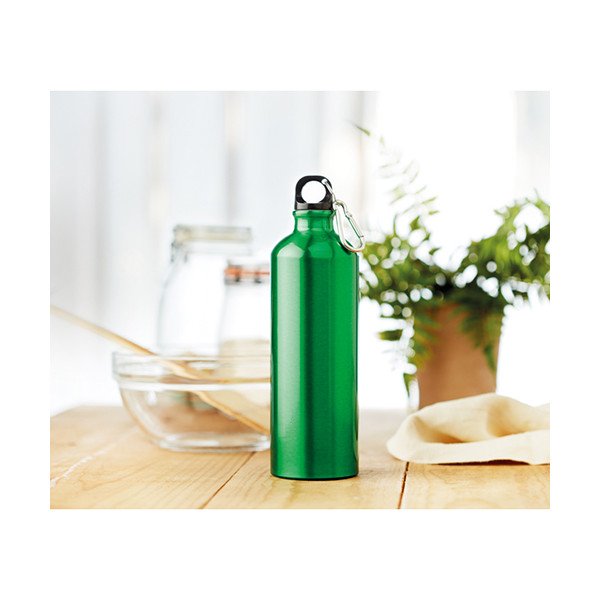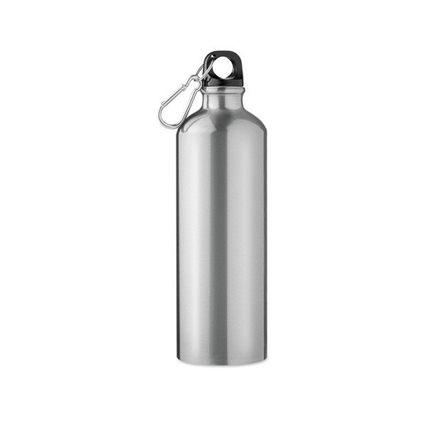 Botella de aluminio con mosquetón. Capacidad de 750 ml. Medidas: 7x25cms. Peso: 130 gr. Composición: Aluminio.