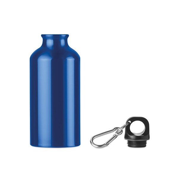 Botella de aluminio de una sola capa con mosquetón. Capacidad 400 ml. Medidas: Ø6x17 cms. Peso: 90 grs. Composición: Mezcla.