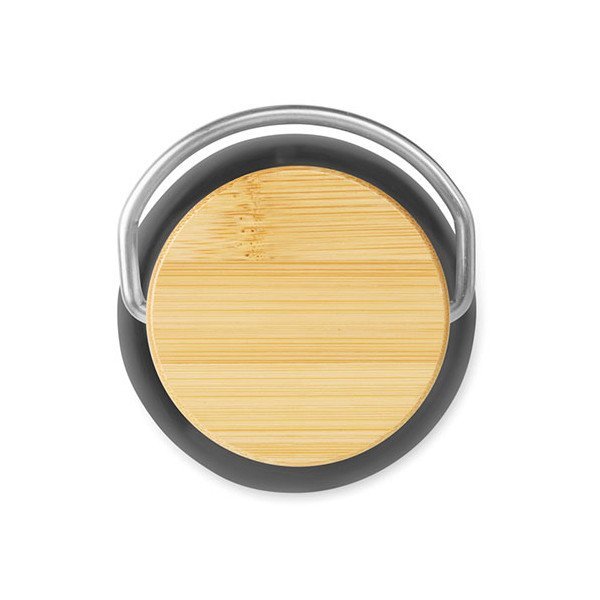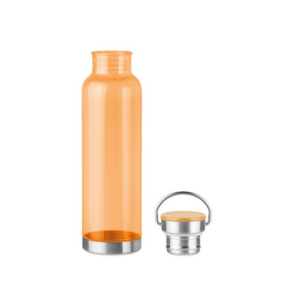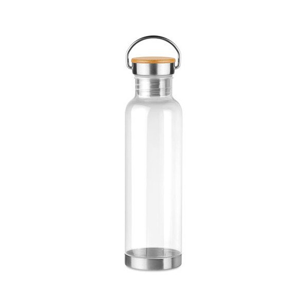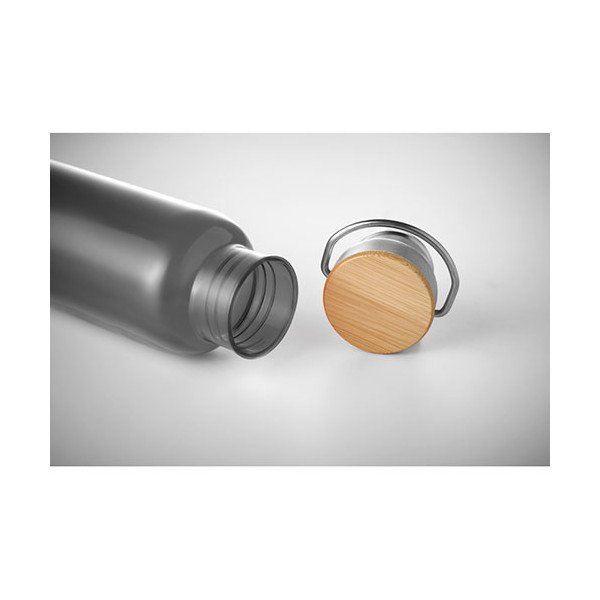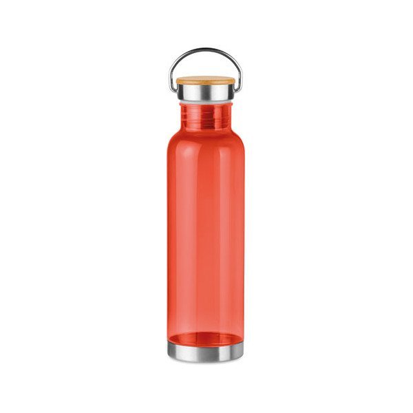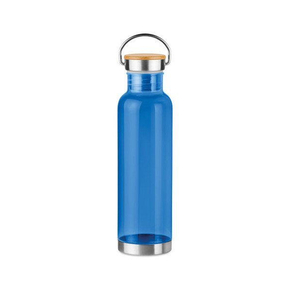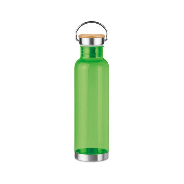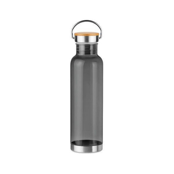 Botella en Tritán con base de acero inoxidable y tapa de bambú.