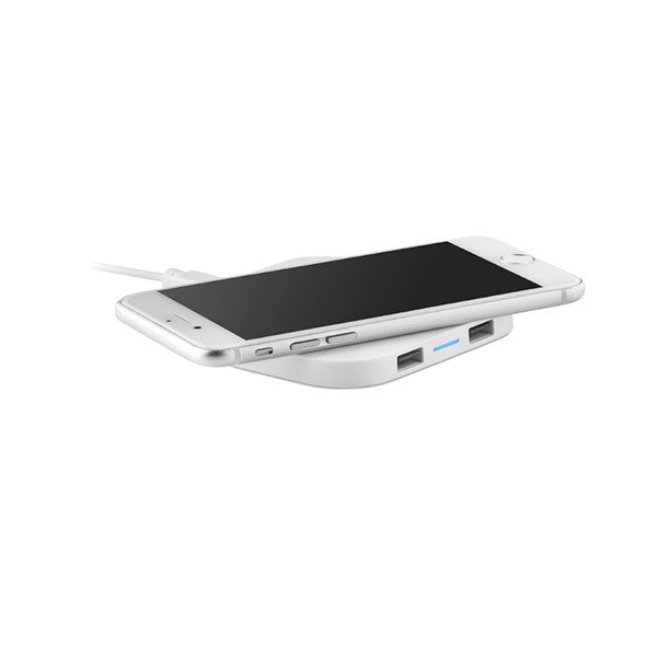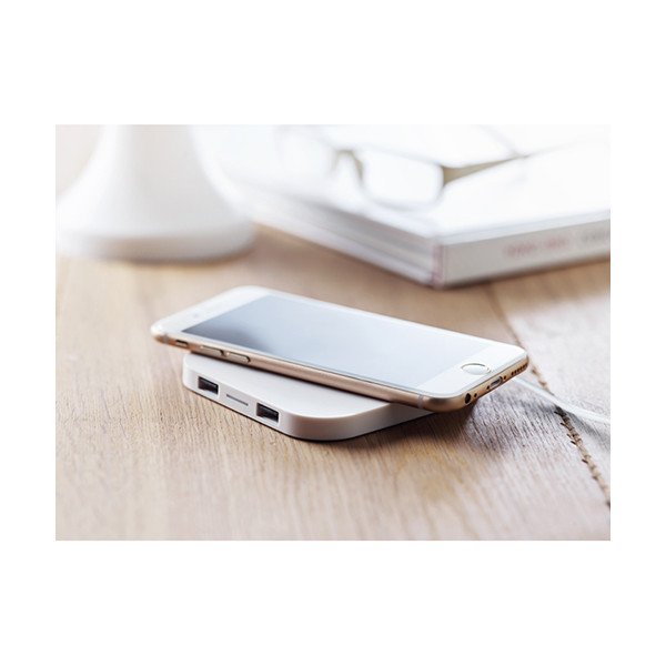 Base de carga inalámbrica para smartphone y hub de 2 puertos USB. Output DC 5V/ 1.0A. Compatible con últimos modelos Android, iPhone 8, 8S, X y posteriores. Medidas: 9x9x0,9 cms. Peso: 98 gr. Composición: Plástico ABS.