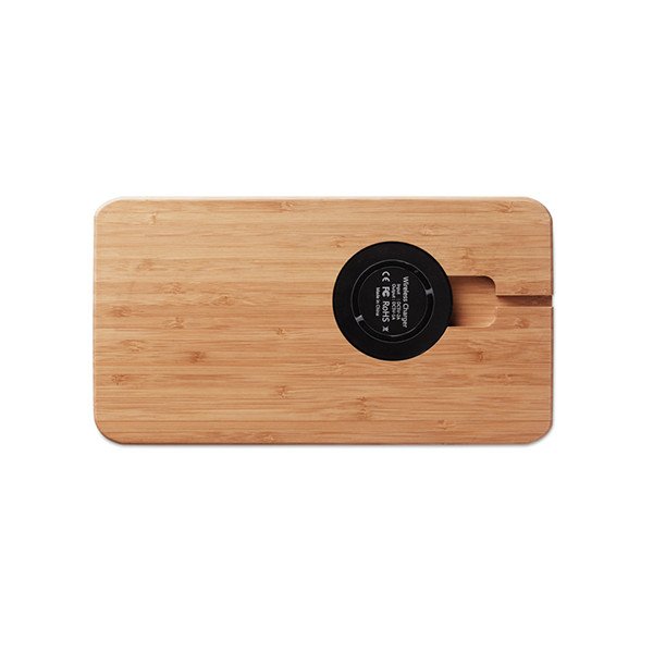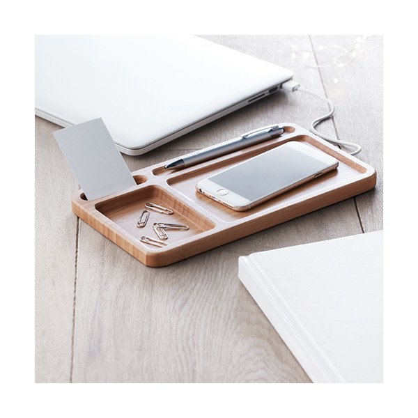 Cajita de sobremesa de bambú con cargador inalámbrico. Incluye cable de carga USB de 80 cm. Output: DC 5 V/1A. Compatible con todos los dispositivos compatibles con Qi, como los últimos Android, iPhone® 8, 8S, X y más recientes. Medidas: 27x14,6x1,5 cms. Peso: 467 grs.