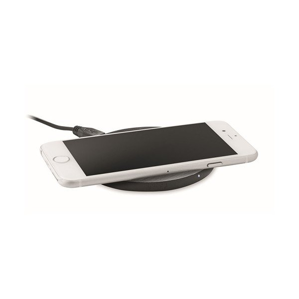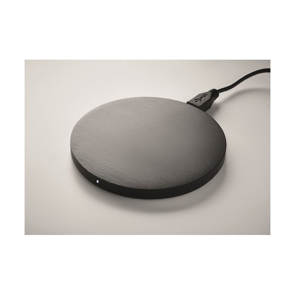 Cargador inalámbrico de bambú. Conecte el dispositivo a su ordenador, coloque su teléfono encima y deje que se cargue. Durante la carga se enciende la luz azul. Output: DC 5V/1,0A. Compatible con todos los dispositivos dotados de tecnología Qi, como los últimos Android, iPhone® 8, 8S y X y más recientes. Medidas: Ø9,1x0,7 cms. Peso: 100 grs.