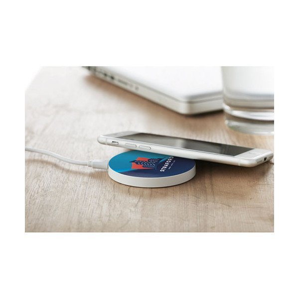 Cargador inalámbrico. Conecte el dispositivo a su PC, coloque el smartphone sobre él y deje que se cargue. output: DC5V / 1.0A. Compatible con los últimos modelos android, iPhone® 8, X y más recientes. Ideal para personalización a todo color. Medidas: Ø7x0,8 cms. Peso: 64 grs. Composición: ABS.