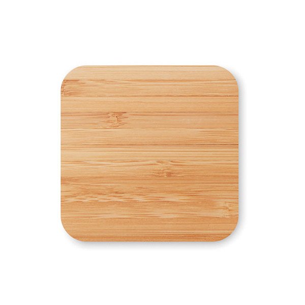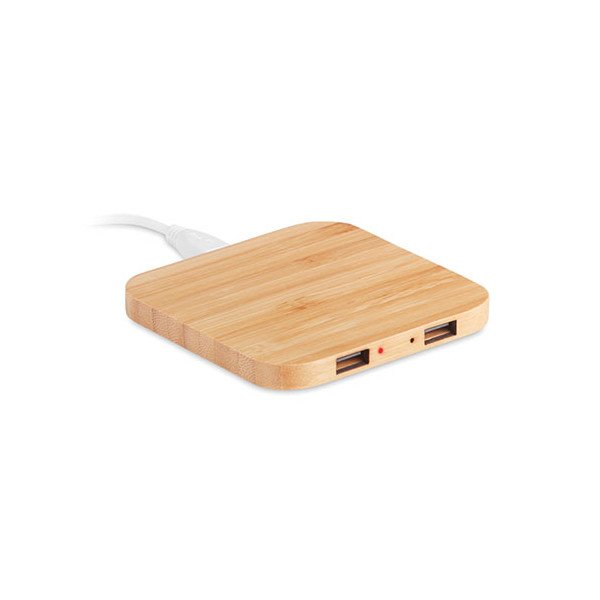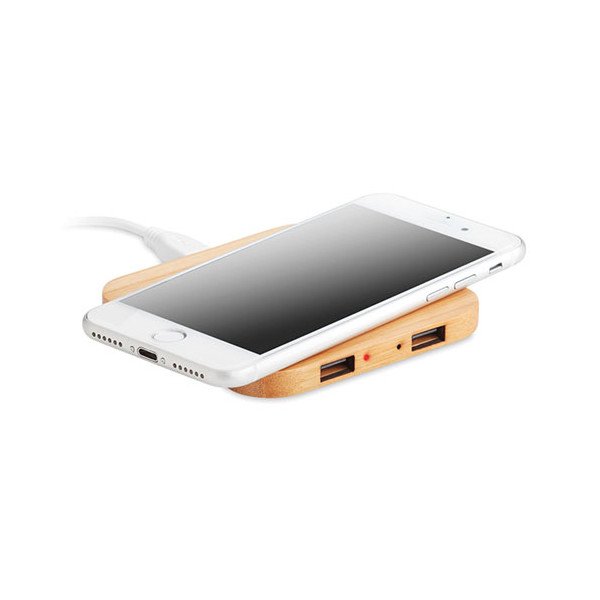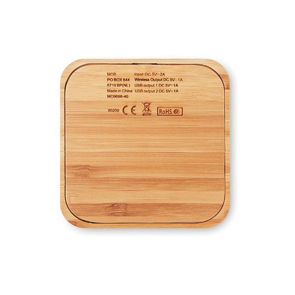 Base de carga inalámbrica con 2 puertos USB 2.0. Output: DC 5V / 1.0A. Compatible con los últimos dispositivos androids, iPhone® 8, X y superior. El bambú es un material natural, el color del articulo puede variar. Medidas: 9x9x0,8 cms. Peso: 88 grs. Composición: Mezcla.