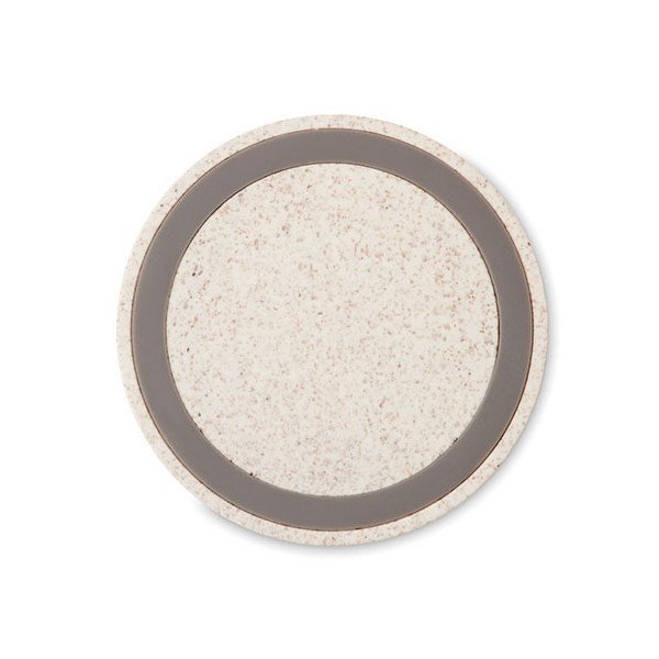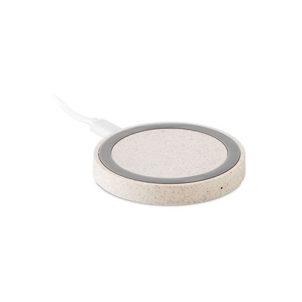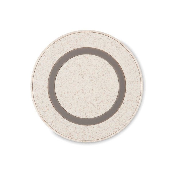 Cargador inalámbrico de paja de trigo (35%) y ABS (65%). Conecte el dispositivo a su ordenador, coloque su teléfono encima y deje que se cargue. Output: DC5V/0 ,8A. Compatible con los últimos dispositivos androids, iPhone® 8, X y superior. Medidas: Ø7x1 cms. Peso: 61 grs. Composición: Mezcla.