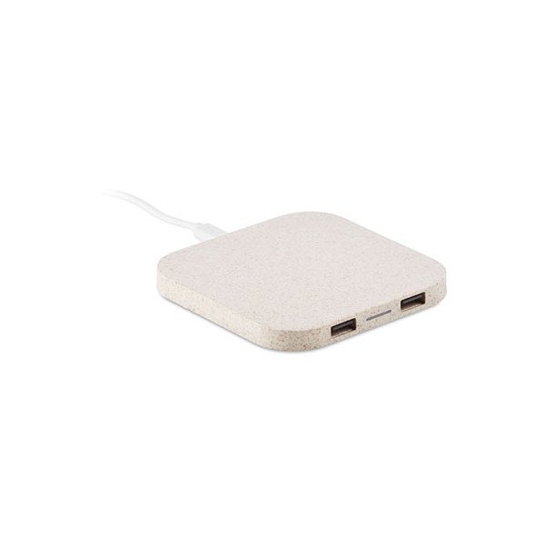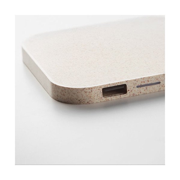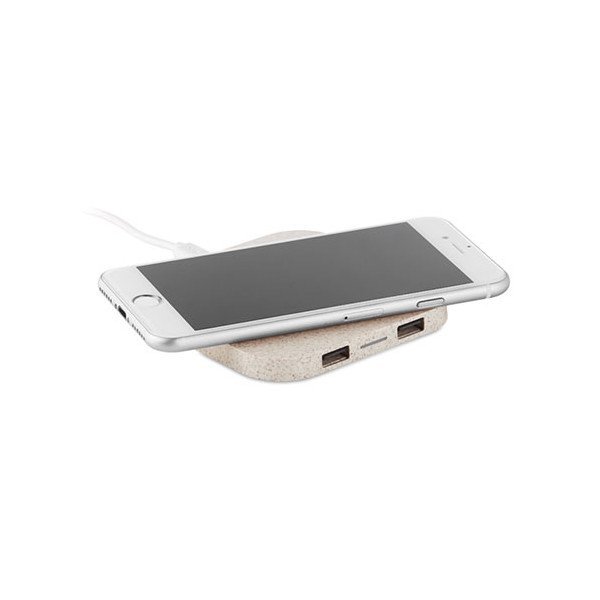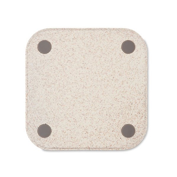 Base de carga inalámbrica de paja de trigo (35%) y ABS (65%) 2 puertos para carga de USB 2.0. Conecte el dispositivo a su ordenador, coloque su teléfono encima y deje que se cargue. Output: DC5V/0,8A. Compatible con los últimos dispositivos androids, iPhone® 8, X y superior. Medidas: 9x9x0,9 cms. Peso: 81 grs. Composición: Mezcla.