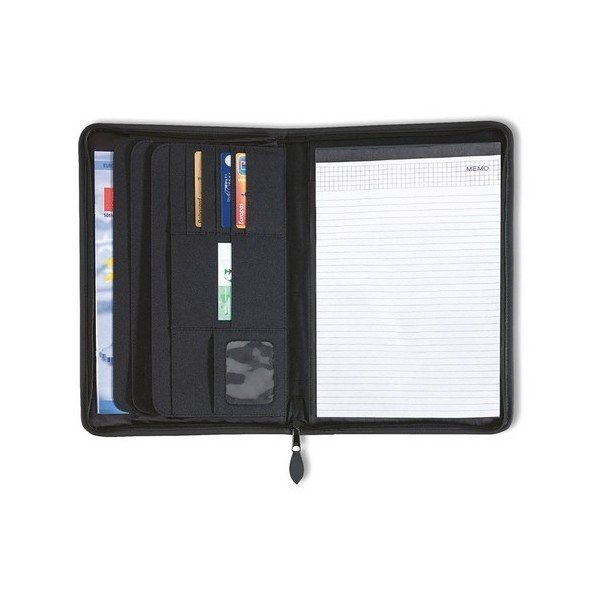 Porta documentos A4 con cremallera, 4 compartimentos y porta tarjetas. Incluye bloc de notas de 20 hojas. Material poliéster 600D, forro 210T. 36x25x1,5 cm