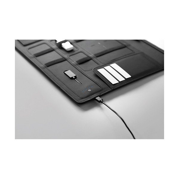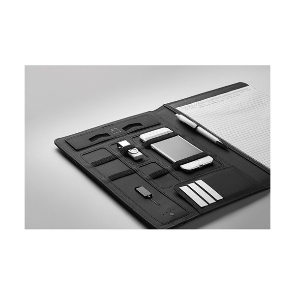 Porta folios A4 en lino PU con cierre. Incluye cargador inalámbrico (Output DC5V / 1A) y powerbank de 4000 mAh, con un conector micro USB a Tipo C. Incluye un bloc de notas de 20 páginas y varios bolsillos internos. Este artículo incluye una placa de aluminio negra ideal para su logotipo. Medidas: 23x31x2 cms. Peso: 1.400 grs.