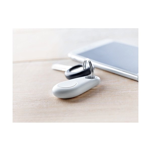Localizador Bluetooth 4.0 para llaves, fabricado en ABS. Requiere aplicación gratuita (iSearching) disponible en iOS y Android. Incluye botón disparador para selfies y botón localizador de móvil. 1 pila CR2032 incluida. Medidas: 5x3x1 cms. Peso: 26 gr. Composición: Plástico.
