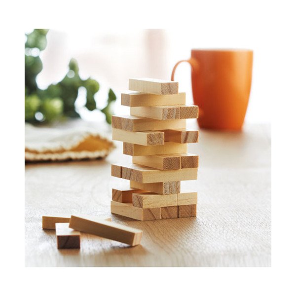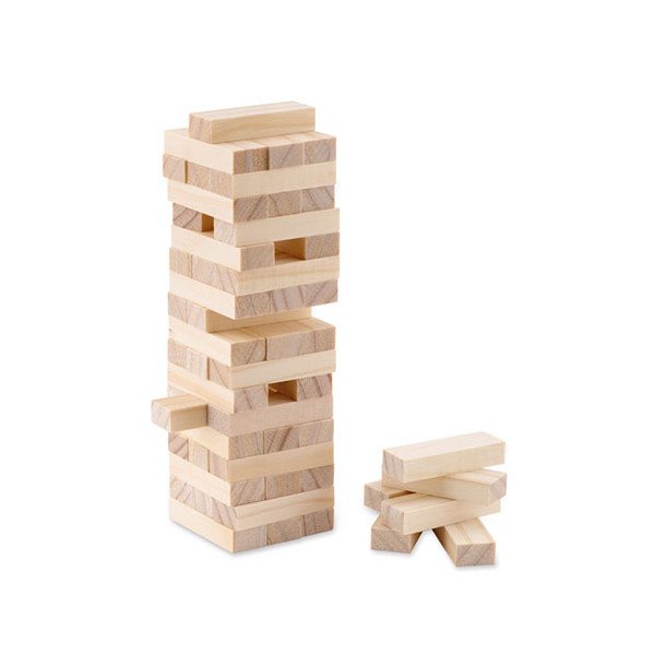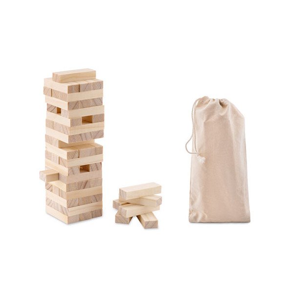 Juego de mesa de madera con 54 bloques, presentado en funda de algodón. Medidas: 5x5x17,5 cms. Peso: 290 grs. Composición: Mezcla.
