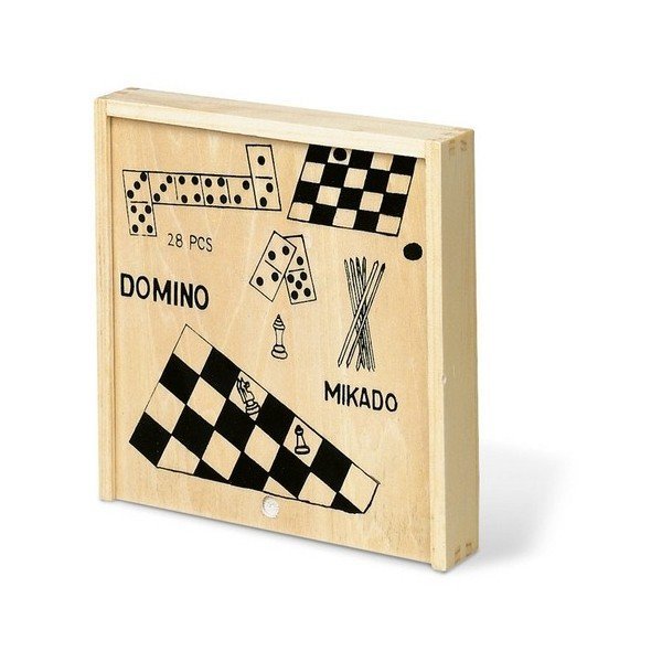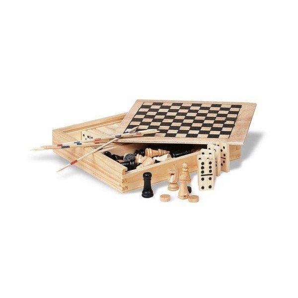 Caja de madera con 4 juegos: dominó, ajedrez, damas y palos de madera. Medidas: 16,5x16,5x2,8 cm.