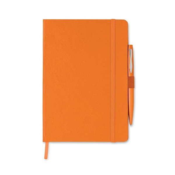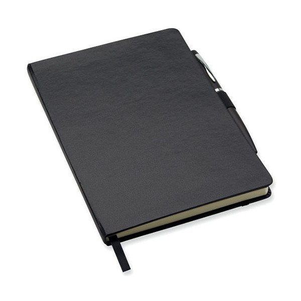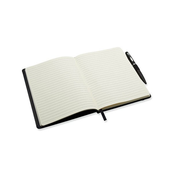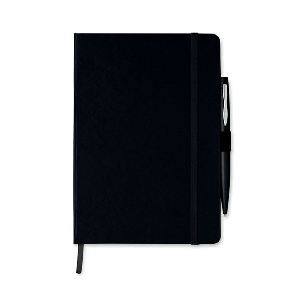 Libreta A5 con tapa rígida, 72 páginas de papel rayado, banda elástica y marcapáginas. Incluye bolígrafo con tinta azul. 21x14,5x1,2 cm