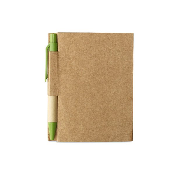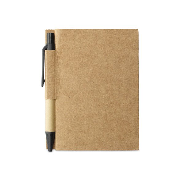 Libreta de bolsillo en material reciclado y 80 páginas. Incluye pequeño bolígrafo con tinta azul. Medidas: 11x8,5x0,9 cms. Peso: 65 gr. Composición: Papel.