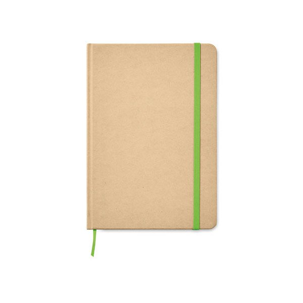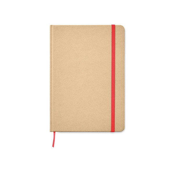 Libreta A5 de cartón reciclado con marca paginas de colores a juego y banda elástica. 80 hojas en papel rayado. Medidas: 21x14x1,1 cms. Peso: 270 grs. Composición: Papel.