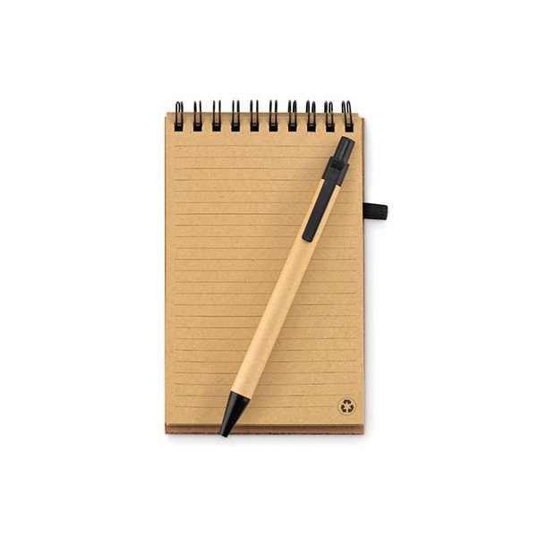 Libreta A6 con 70 hojas rayadas de papel reciclado y tapa de corcho. Bolígrafo hecho de cartón reciclado y partes de almidón de maíz (PLA). Tinta negro. Medidas: 14x9x0,7 cms. Peso: 88 grs. Composición: Papel.