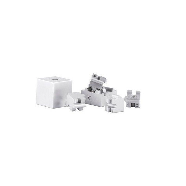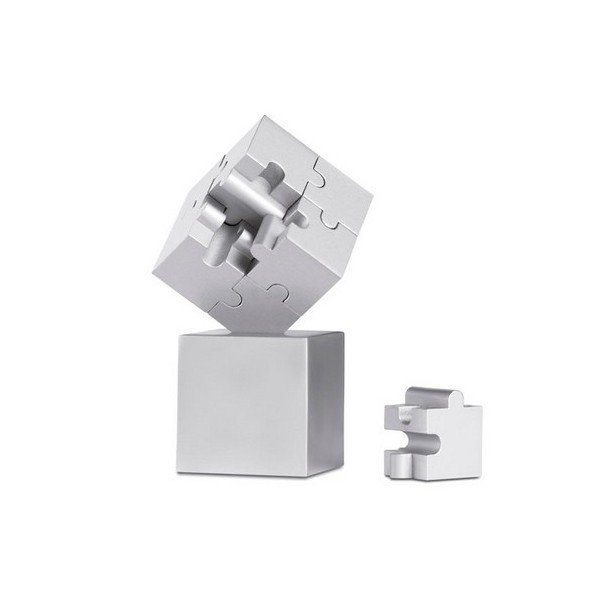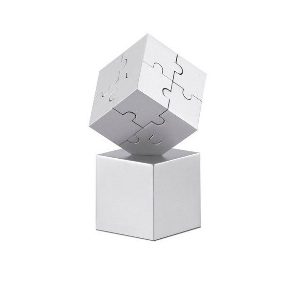 Puzzle 3D magnético con piezas metálicas. Colocado en su base sirve de pisapapeles y de decoración. Medidas: 8x4 cm.