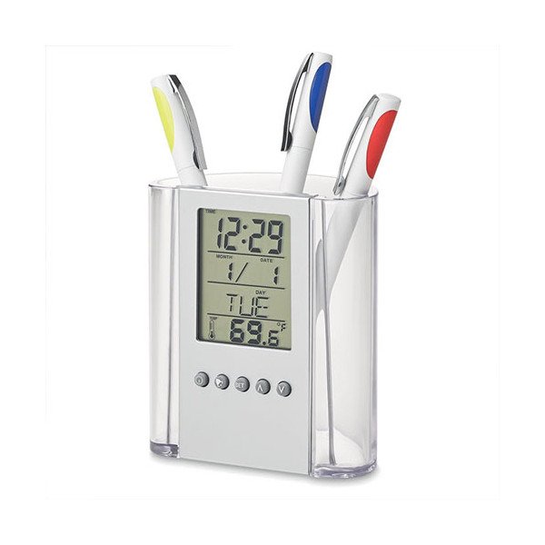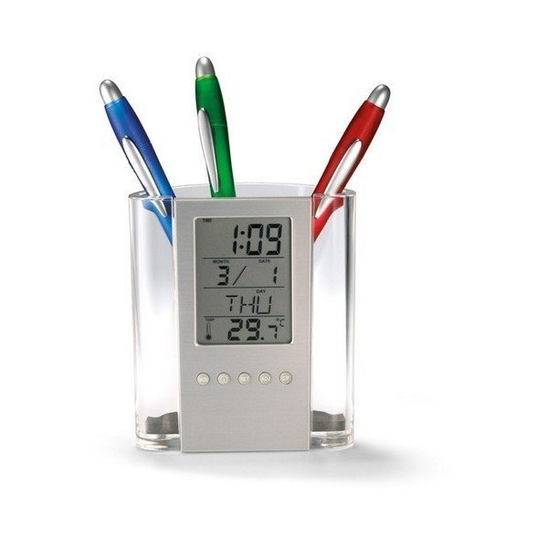Posalápices con calendario, reloj y termómetro. 1 pila botón incluida. Medidas: 10,3x5,4x11,8 cm