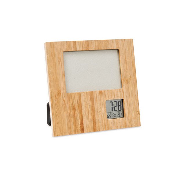 Marco de fotos en bambú con estación meteorológica.