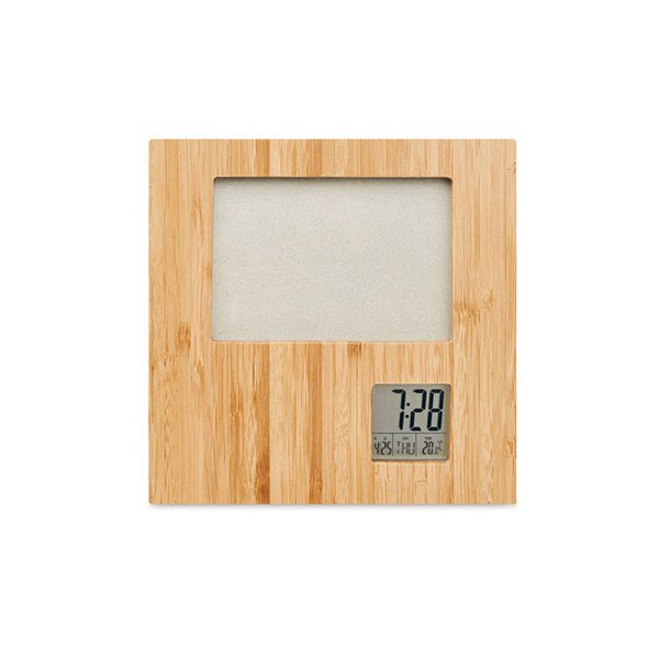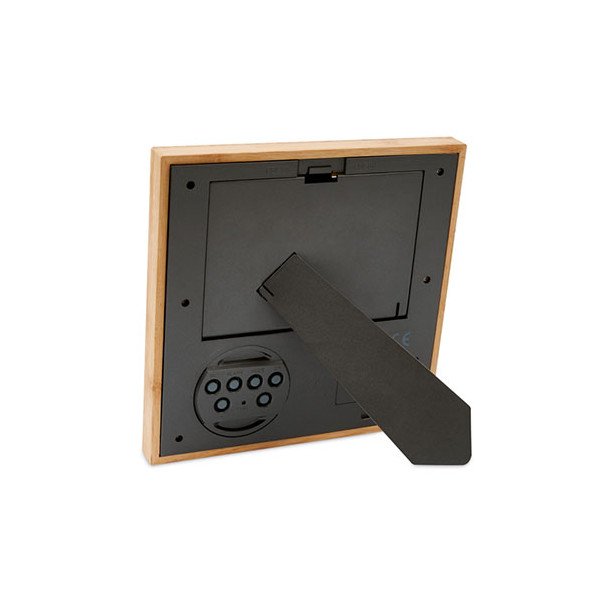 Marco de fotos en bambú con estación meteorológica. Muestra hora, fecha y temperatura. Función de alarma y reloj de cuenta atrás. Funciona con 2 pilas AAA no incluidas. El bambú es un material natural, el color del articulo puede variar. Medidas: 18,5x18,5x2 cms. Peso: 375 grs. Composición: Mezcla.