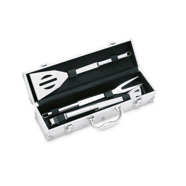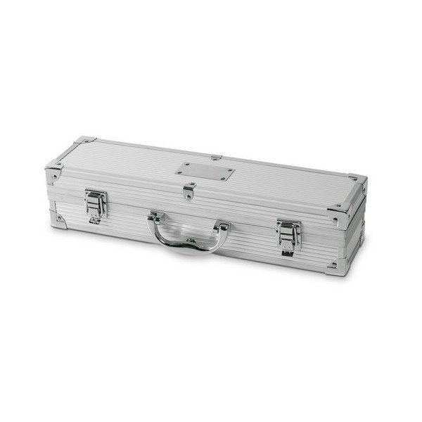 Maletín de aluminio que incluye 3 utensilios de barbacoa en acero inoxidable. Amplia superficie para el logo. Medidas: 37x10x8 cm.