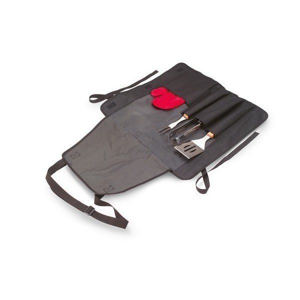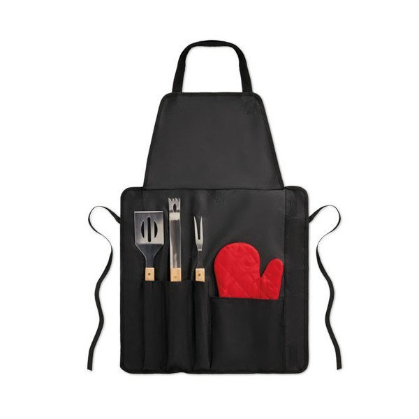 Delantal con 3 utensilios de barbacoa y un guante. Delantal realizado en poliéster 600D. Medidas: 74x50x2 cm.