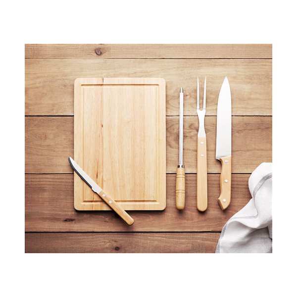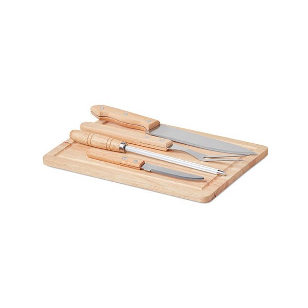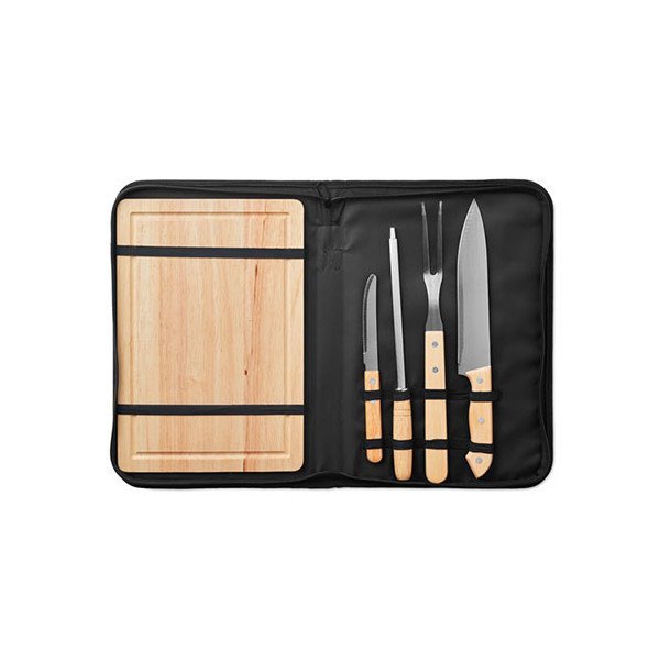Set de 4 accesorios de barbacoa de acero inoxidable con tabla de cortar de madera, presentado en estuche de poliéster. Incluye cuchillos, tenedor y afilador. El bambú es un material natural, el color del articulo puede variar. Medidas: 36x3x24 cms. Peso: 1,2 Kgs. Composición: Mezcla.