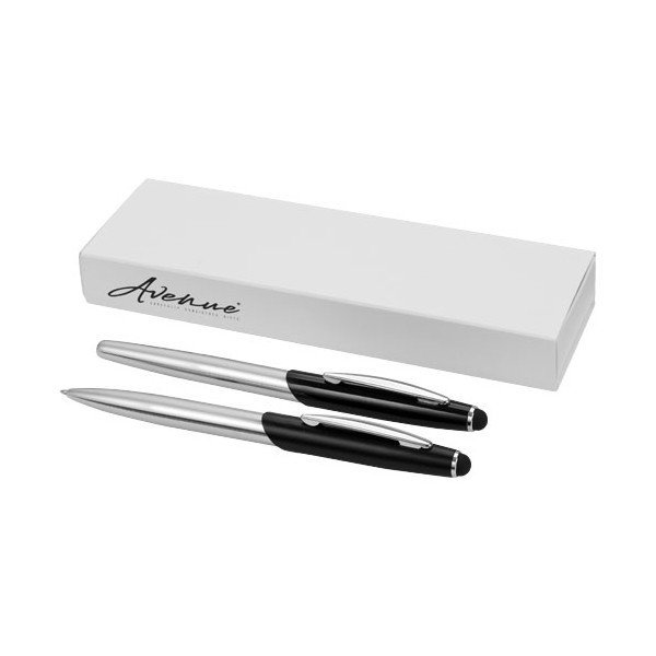 Set de bolígrafo-puntero y rollerball Geneva. Bolígrafo-puntero y rollerball de líneas sofisticadas con una caña superior mate y una caña inferior cromada brillante, con toques cromados a juego en un estuche de regalo deslizante para bolígrafos de Avenue (tamaño: 16,9 x 5,2 x 2 cm). Material: Metal. Medidas: 13,5 x Ø 0,9 cm. Peso: 22 gr.