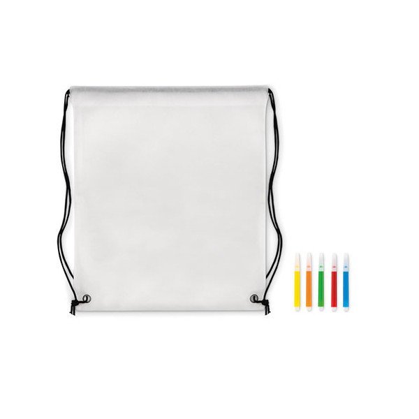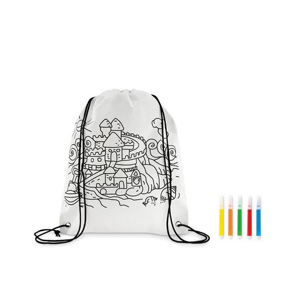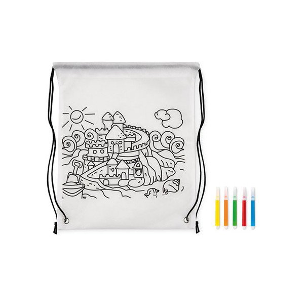 Bolsa non woven para colorear. Incluye 5 rotuladores. 80 gr/m². Medidas: 35x28 cms. Peso: 40 grs. Composición: Non woven.