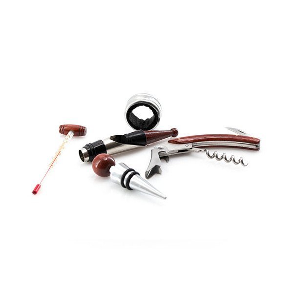 Set Vinos Baco. 5 Accesorios. 1 Sacacorchos; 1 Termómetro; 1 Dosificador, 1 Tapón, 1 Recogegotas.