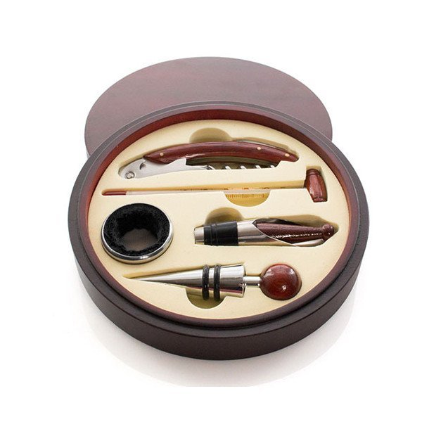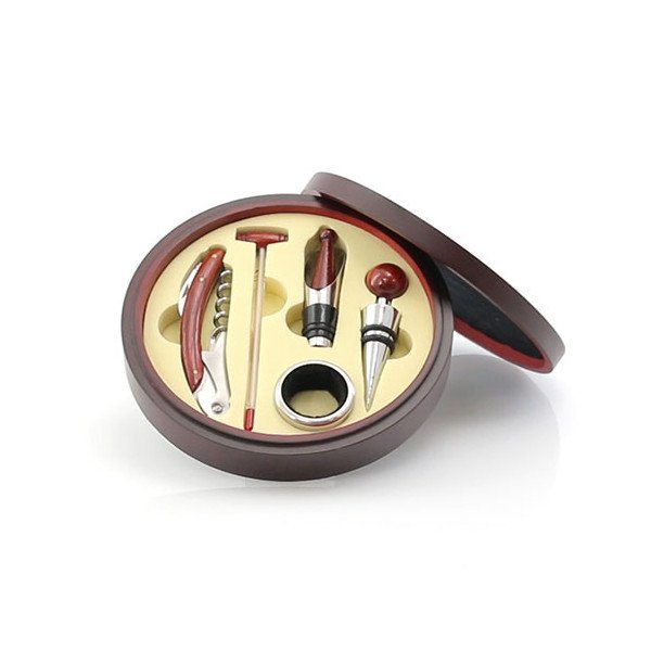 Set de vino que incluye: sacacorchos, tapón, dosificador y anillo antigoteo.