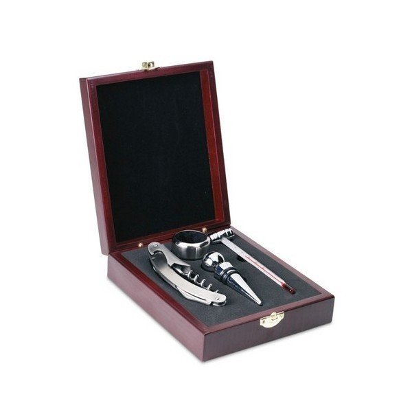 Elegante set de vino presentado en caja de madera compuesto de tapón para el vino, sacacorchos, recoge gotas y termómetro. Medidas: 17,5x14,5x4,8 cm.