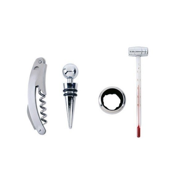 Set de vino que incluye: sacacorchos, tapón, dosificador y anillo antigoteo.