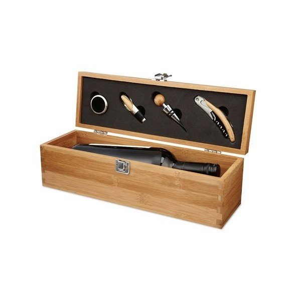 Set de vino en caja de bambú con espacio para una botella. Incluye: recogegotas, dosificador, tapón y sacacorchos. Botella de vino no incluida. Medidas: 36x11x11 cm.