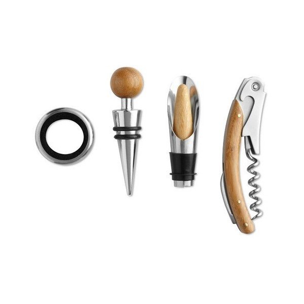 Set de vino que incluye: sacacorchos, tapón, dosificador y anillo antigoteo.