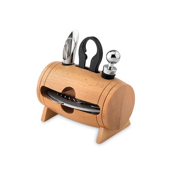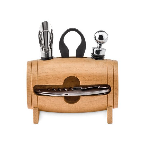 Soporte de madera y set de 4 accesorios para vino: sacacorchos, tapón, dosificador de vino y corta cápsulas. Medidas: 13x8x14 cms. Peso: 481 grs. Composición: Mezcla.