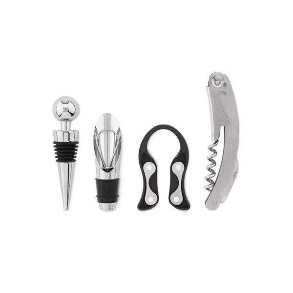 Set de vino que incluye: sacacorchos, tapón, dosificador y anillo antigoteo.
