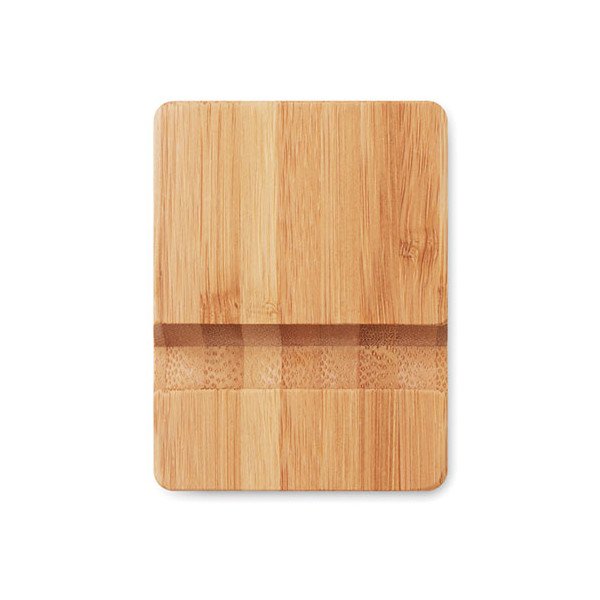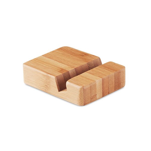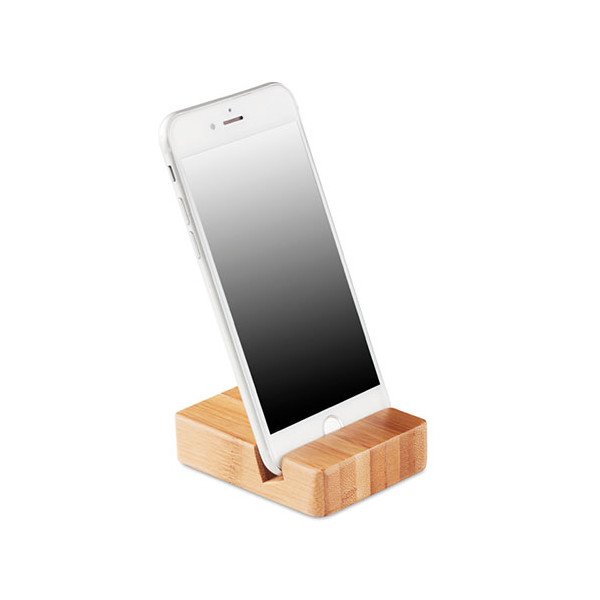 Soporte para teléfono de bambú. El bambú es un material natural, el color del articulo puede variar. Medidas: 7,5x6x2 cms. Peso: 73 grs. Composición: Bambú.