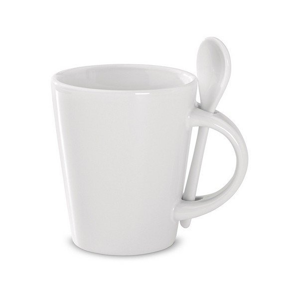 Taza con cuchara de cerámica. Capacidad para 340 ml. Preparada para sublimación. Medidas: Ø8,5x12 cm. Peso: 353 gr.