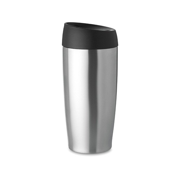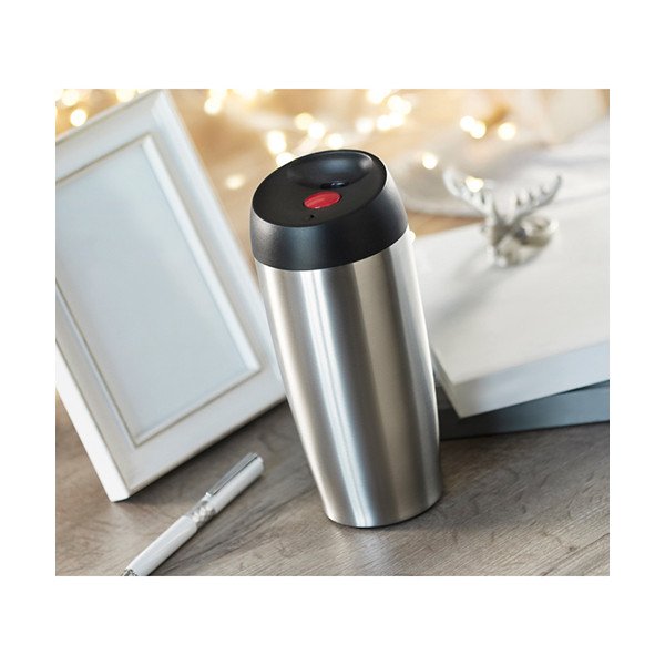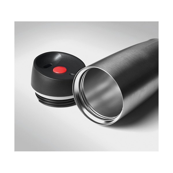 Taza de acero inoxidable de doble pared. Capacidad 400 ml, tapa de PP. A prueba de fugas y con función de seguro. Medidas: Ø7.5x18.5cms. Peso: 267 gr. Composición: Acero inoxidable.