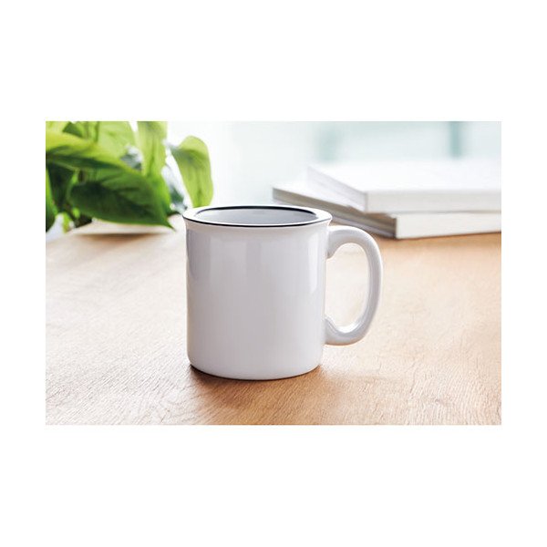 Taza de cerámica estilo vintage de 240 ml de capacidad con recubrimiento especial para impresión por sublimación. Medidas: Ø8,5x8,5 cms. Peso: 319 grs. Composición: Cerámica.