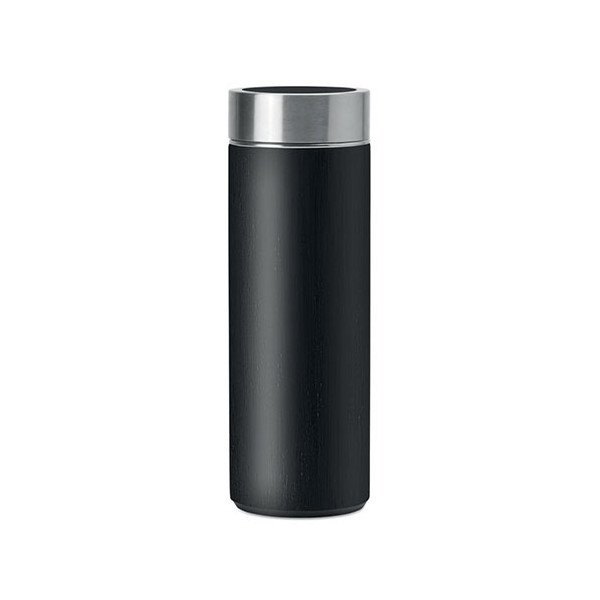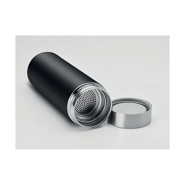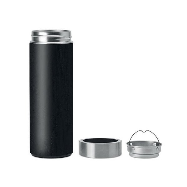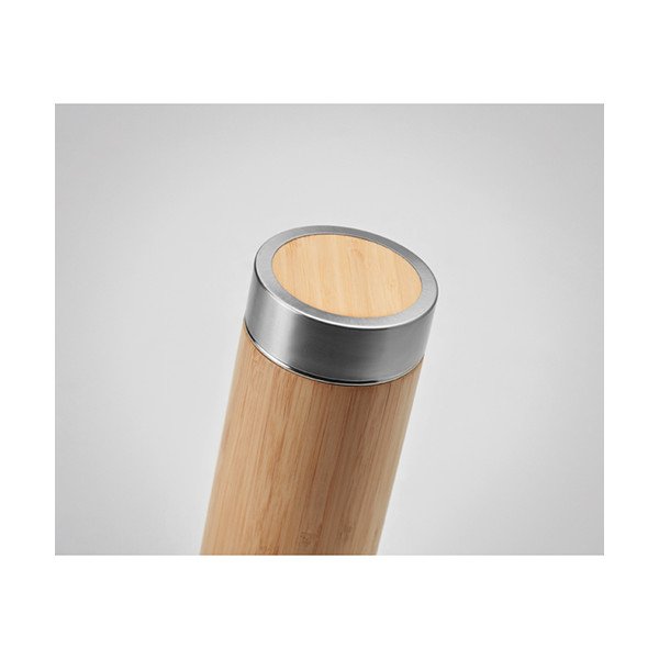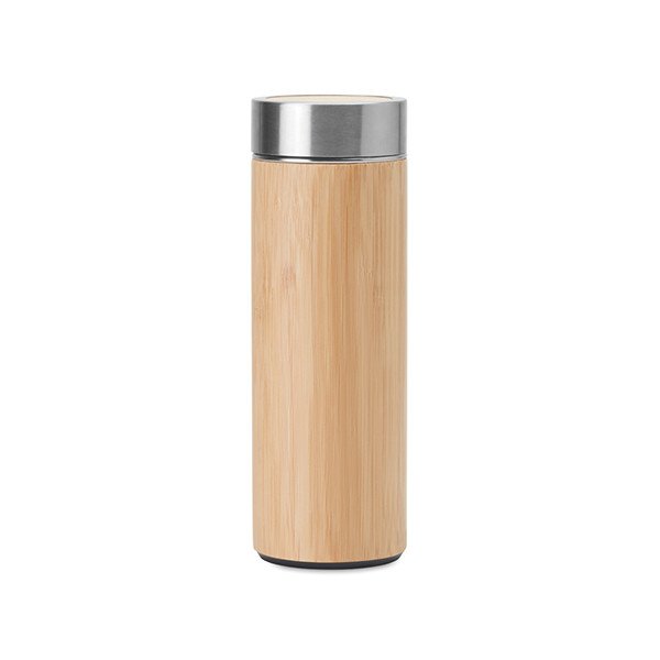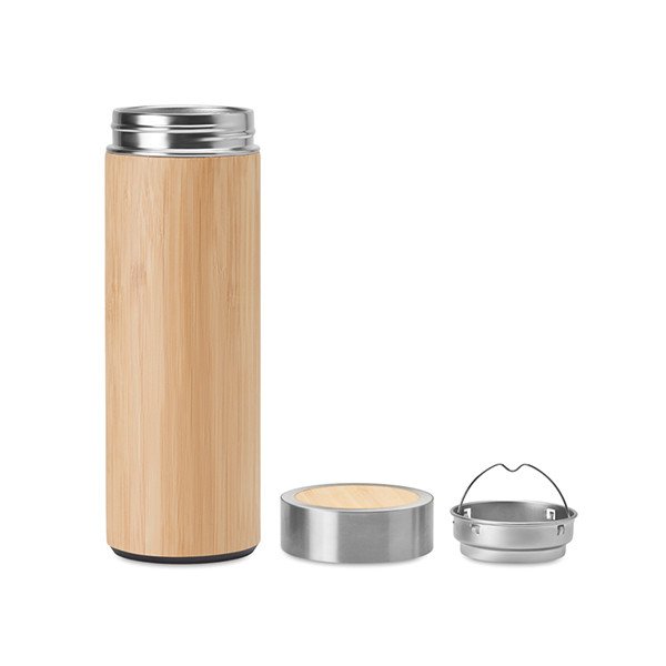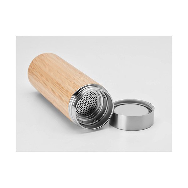 Termo aislante de 400 ml con infusor de té adicional, con doble pared de acero inoxidable y cobertura de bambú. Medidas: Ø6.5x20 cms. Peso: 360 grs.