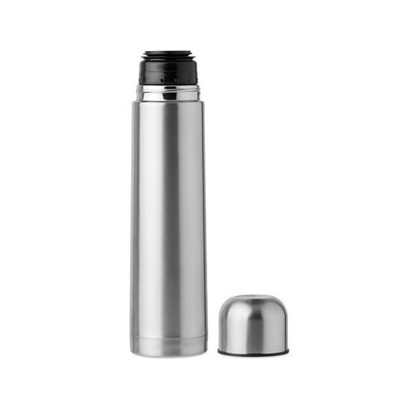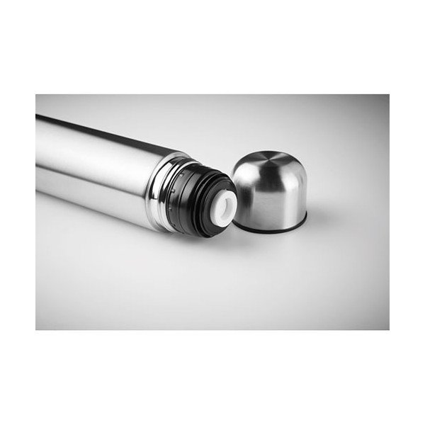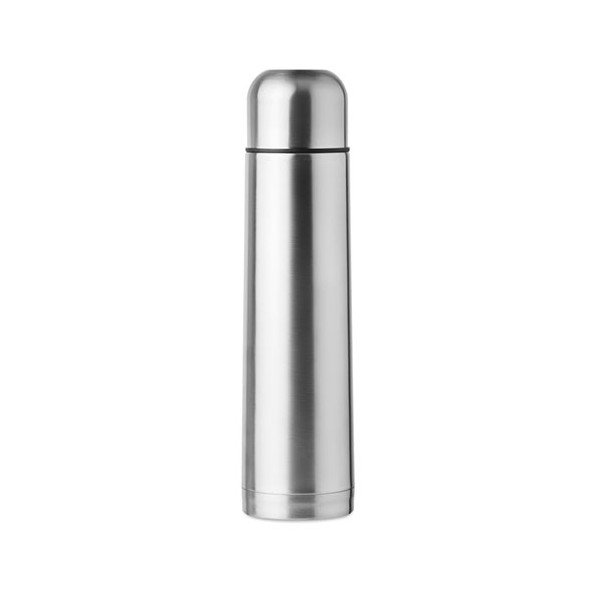 Termo de acero inoxidable de doble pared. Capacidad 1 L. Medidas: Ø8x32 cms. Peso: 635 grs. Composición: Mezcla.