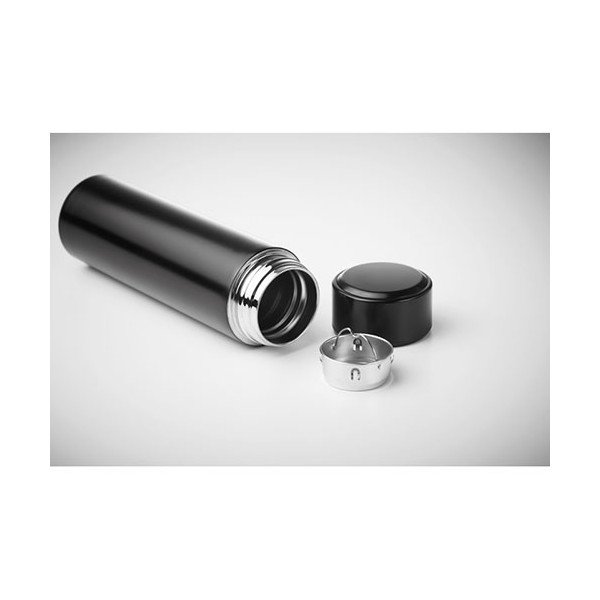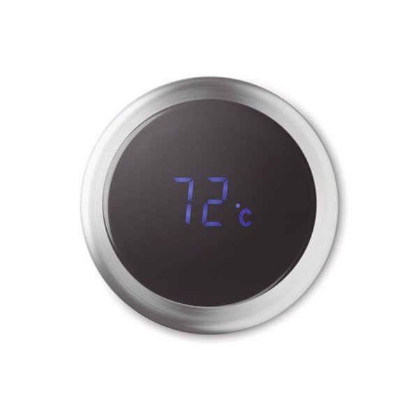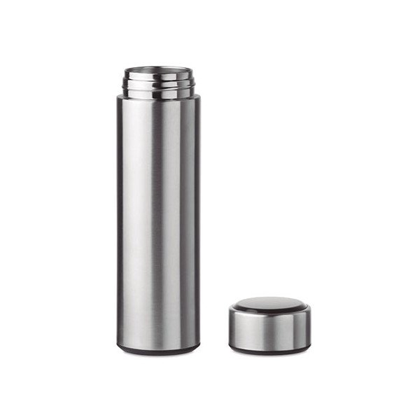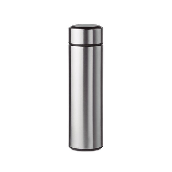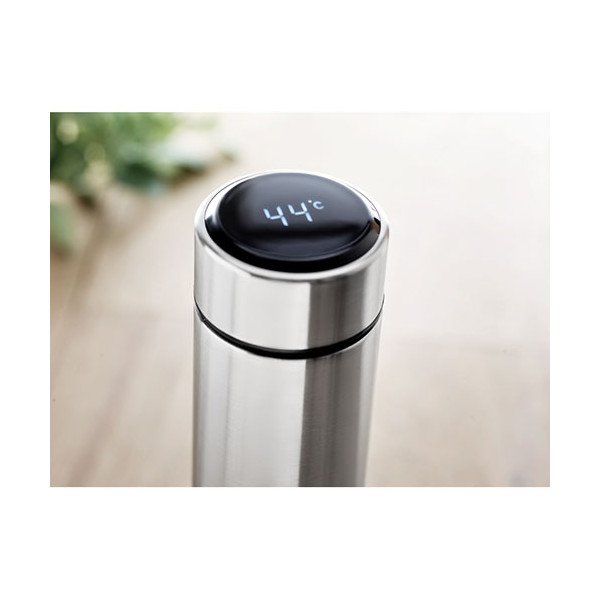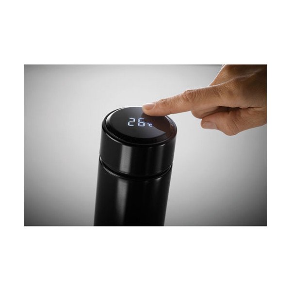 Termo con doble pared de acero inoxidable. Incorpora en la parte superior termómetro táctil LED e infusor. Anti-fugas. Funciona con pila CR 2450 (incluida). Capacidad 450 ml. Medidas: Ø6x23 cms. Peso: 320 grs. Composición: Mezcla.