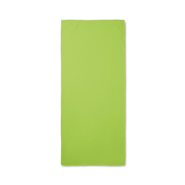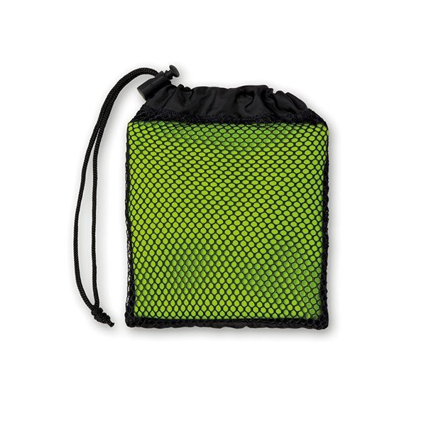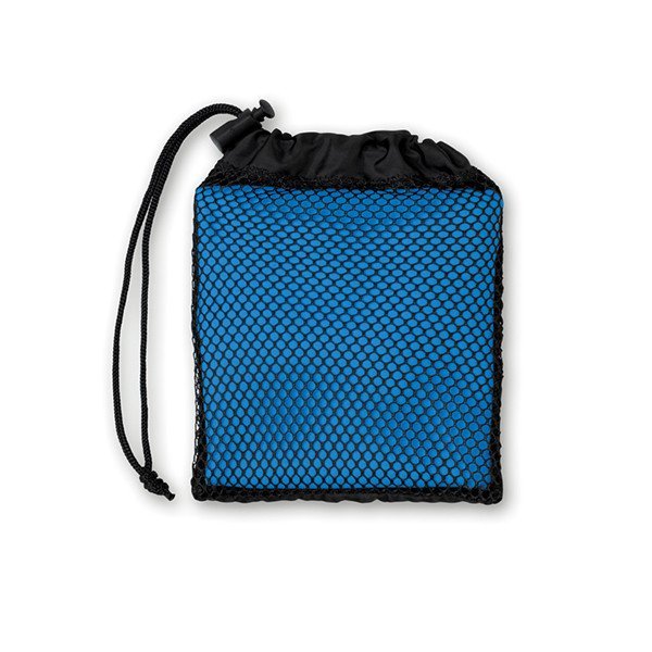 Toalla de deporte en funda de rejilla. 20% poliamida y 80% microfibra. Medidas: 35x80cms. Peso: 63 gr.