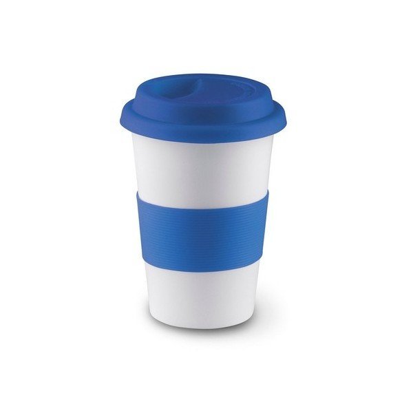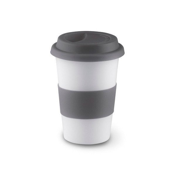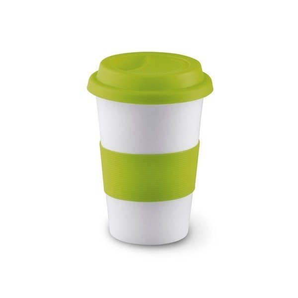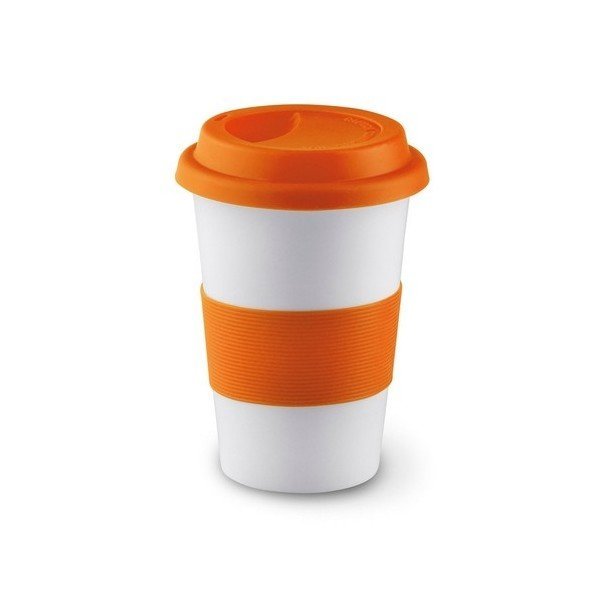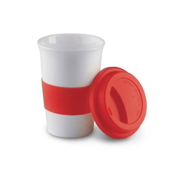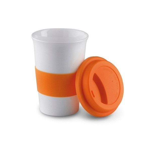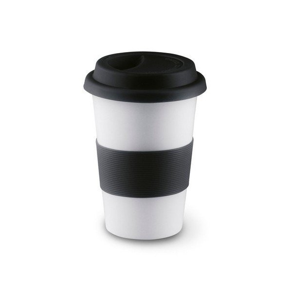 Vaso de cerámica con tapa y franja de silicona para agarrarlo. Capacidad 400 ml. No apto para microondas. Medidas: Ø9x12 cm